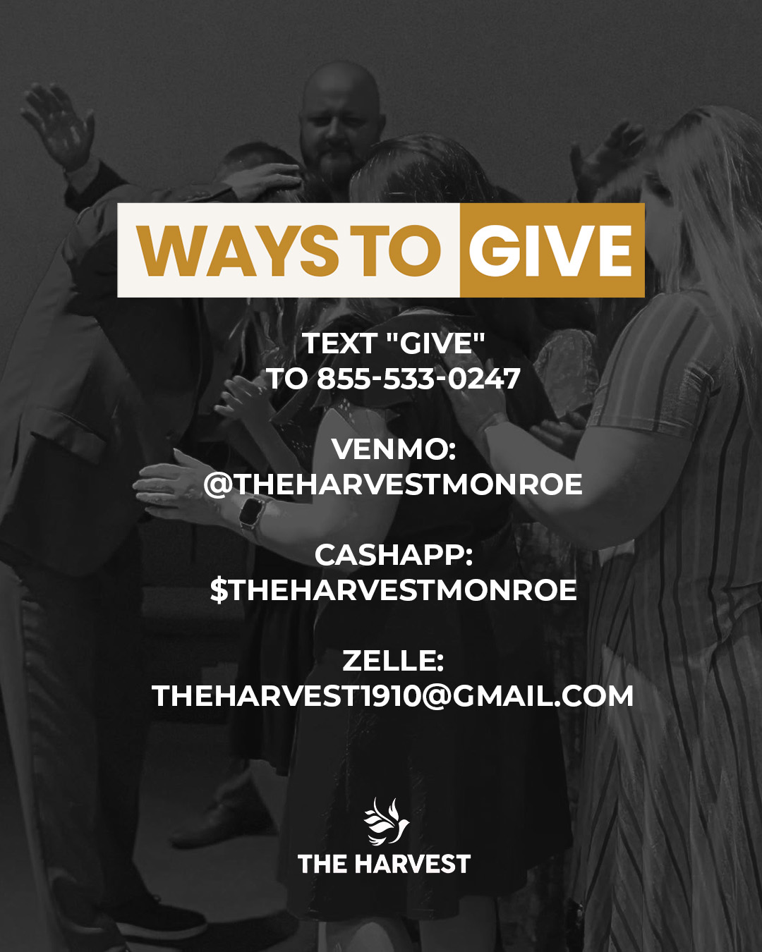 Your generosity helps support the ministry and work of The Harvest. Through giving, you partner with us as we worship God, serve our church family, and continue sharing the gospel.